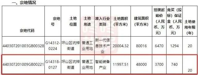 G14318-0127宗地,位于坪山区坑梓街道,准入行业为智能装备工业,建面4.8万平,挂牌起始价3700万元,土地使用年限为20年。须自《出让条约》签订之日起1年内开工,3年内竣工。