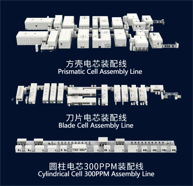 In the mid-stage of lithium battery manufacturing, the cell assembly process requires highly for equipment precision, efficiency, and stability. We launched the 30PPM prismatic cell high-speed assembly line, the 24PPM blade battery fully automated assembly line, and the 300PPM cylindrical cell assembly line. These innovations respond rapidly to high production demands and lead the way in cutting-edge intelligent manufacturing.
