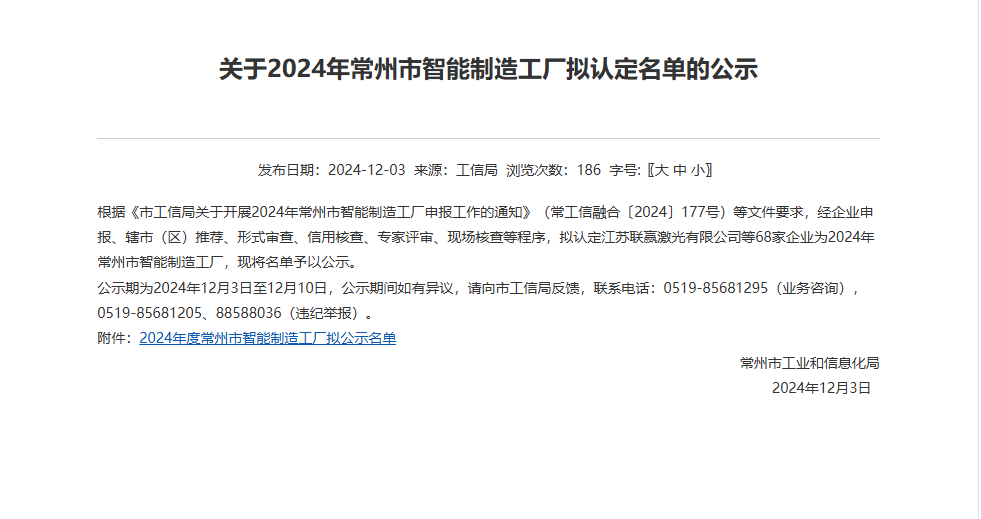 Recently, the Jiangsu Provincial Department of Industry and Information Technology officially released the list of intelligent manufacturing workshops for 2024. Jiangsu United Winners Laser Co., Ltd. (UW Jiangsu), leveraging its outstanding achievements in intelligent transformation and digitalization, has been successfully selected as a "Jiangsu Province Intelligent Manufacturing Workshop". This is the second time that UW Jiangsu has received this prestigious honor since it was first awarded the "Jiangsu Province Intelligent Manufacturing Workshop" in 2023! In addition, with its exceptional strength in intelligent manufacturing, UW Jiangsu has also been successfully recognized as a "Changzhou City Intelligent Manufacturing Factory".