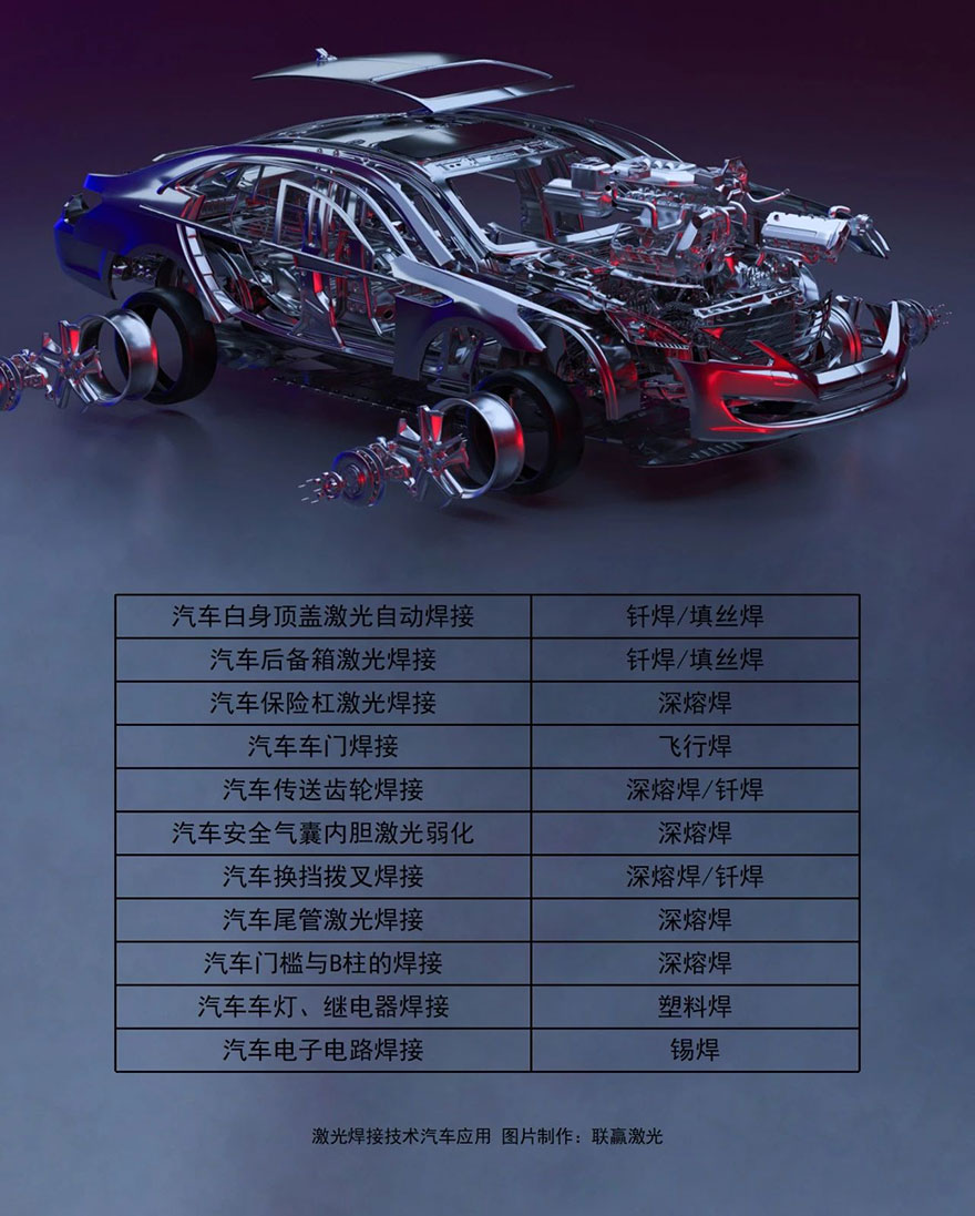 激光焊接在汽车制造中的应用具有高效性与精密性的特点。激光焊接主要用于车身框架结构的焊接,例如顶盖与侧面车身的焊接,传统焊接要领的电阻点焊已经逐渐被激光焊接所取代。用激光焊接技术,工件连接之间的接合面宽度可以淘汰,既降低了板材使用量,也提高了车体的刚度。