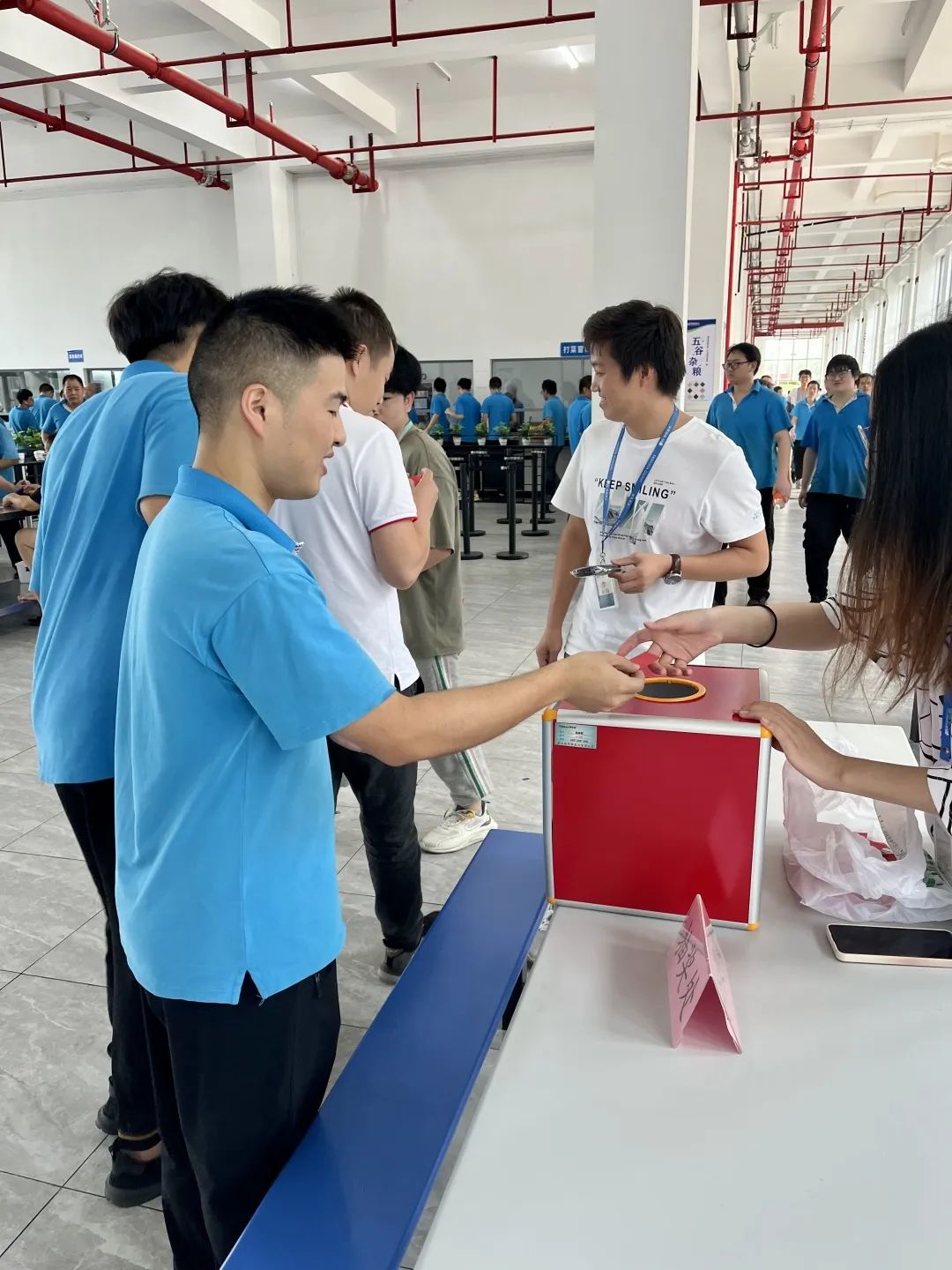 Ô±¹¤Æ¾ÃÅÆ±ÔÚÊÂÇéÈËÔ±µÄÖ¸µ¼ÏÂÓÐÐòÅŶӣ¬Ò»¹²ÉèÖÃÁ½ÌõͶºøÂ·Ïß¡£Ã¿ÈË·ÖµÃ5Ö§¼ý£¬ÔÚÒ»Ã×ÎåÏßÍâͶºø£¬Í¶ÈëºøÖÐ2Ö§¼°ÒÔÉϼ´¿É»ñµÃÒ»Õų齱ȯ£¬È«ÖÐ5Ö§¼´¿É»ñµÃÁ½Õų齱ȯ¡£Í¶ºøÕ½¿öÒ²ÊÇÊ®·ÖÃÍÁÒ£¬ÓеÄÔ±¹¤Ò»·¢»÷ÖУ¬ÇáËÉ»ñµÃ³é½±È¯£¬ÓеĿÉÁ¯ÍÞÒ»´Î¶¼Ã»Àֳɣ¬»¹ÐèÔÙ½ÓÔÙÀ÷¡£