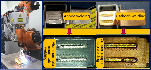 ¸Ç°åÉÏµÄµç³Ø¼«ÖùÓÐÄÚÍâÁ¬½Ó£ºÔÚµç³ØÄÚ²¿£¬µçо¼«¶úºÍ¼«ÖùÖ®¼ä½øÐк¸½Ó¡£ÔÚµç³ØÍⲿ£¬µç³Ø¼«Öùͨ¹ýÁ¬½ÓÆ÷º¸½ÓÐγɴ®Áªµç·ºÍ²¢Áªµç·£¬×é³Éµç³ØÄ£¿é¡£TabΪµç³ØÕý¸º¼«£¬ÂÁΪÑô¼«£¬ÍΪÒõ¼«¡£Æ¾¾Ýµç³ØÐͺŲîÒ죬ÂÁ£¨Í£©¼«¶úµÄ³ß´çÒ²²îÒì¡£ÔÚÂú×ãÀÁ¦ºÍµçµ¼ÂÊÉè¼ÆÒªÇóµÄǰÌáÏ£¬ÓÅÏÈÑ¡Óü¤¹â¹âÊøÖÊÁ¿ºÃ¡¢¹â°ßСµÄ¹âÏ˼¤¹âÆ÷¡£Í¼ 10 ÏÔʾÁ˹âÏ˼¤¹âº¸½Ó¡¢ÂÁÖ®¼äºÍÍÖ®¼äµç³ØÆ¬µÄ¼¤¹âº¸½Ó¡£