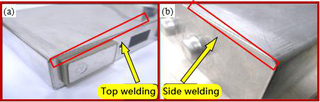 ͼ6ÊÇ·½ÐÎµç³ØµÄ³£¼û½á¹¹Í¼¡£ÆäÍâ¿Ç¸Ç°åµÄº¸½Ó·ÖΪ¶¥º¸ºÍ²àº¸¡£¶¥²¿ÊÇ´øÓÐÑô¼«Òý³ö¶Ë×ӵľØÐθǰ塣½«¸Ç°å·ÅÈëÍâ¿ÇÖУ¬Ê¹ÆäÓëÉÏ¶ËÆëÆ½¡£È»ºóʹÓÃÖØ¸´¡¢Á¬ÐøµÄ¼¤¹âº¸½ÓºÍÃÜ·â¸Ç°åºÍÍâ¿ÇÖ®¼äµÄ½Ó·ì¡£Õâ¸öÀú³Ì³ÆÎª¶¥º¸£¬ÔÚ´ËÀú³ÌÖм¤¹âÊø²»ÐèÒªÒÆ¶¯¡£½«ÀâÖùÐÎµç³ØÀιÌÔÚÊÂÇę́Éϲ¢½«¼¤¹âÊøÃé×¼º¸·ìºó£¬Æô¶¯ÊÂÇę́£¬Ê¹µç³ØÑØÊÂÇę́µÄX¡¢Y×ø±êÒÆ¶¯£¬ÐγÉÓ뺸·ìÏàͬµÄ¾ØÐÎͼ°¸¡£