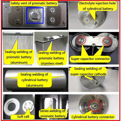 ¶¯Á¦µç³ØÓÐÁù¸ö¼¤¹âº¸½ÓλÖ㬼´¸Ç°åÄþ¾²¿Ú¡¢µçо&¼«Öù¡¢µç³Ø¿Ç¡¢ÃÜ·âÏú£¨µç½âҺעÈë¿×£©¡¢µç³Ø¼«¶ú¡¢µçо¼«¶úºÍ¶¥¸Ç¡£´ËÍ⣬³¬¼¶µçÈÝÆ÷µÄº¸½ÓλÖÃÖ÷ÒªÊÇÁ¬½ÓÆ÷ºÍÒõ¼«£¨·âº¸£©¡£³¬¼¶µçÈÝÆ÷ºÍ²îÒìÀàÐͶ¯Á¦µç³ØµÄ¼¤¹âº¸½ÓλÖÃÈçͼ5Ëùʾ