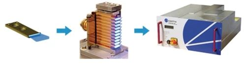 µÚÒ»ÖÖÒªÁìÊǽÓÄɼ¤¹â°ÍÌõ£¨Laser Bars£©¼¼Êõ£¬¼´ÔÚµª»¯î÷ïØ£¨InGaN£©ÖÊÁϵľ§Æ¬ÉÏϵͳµØÉú³É¼¤¹âµ¥Ð¾Æ¬£¨Single Emitter£©£¬ÏȽ«¶à¸öµ¥¶ÀµÄ¼¤¹âоƬ¸ßЧµØ¼¯³Éµ½Ò»¸öËùνµÄ¼¤¹â°ÍÌõ£¬Ã¿¸ö¼¤¹â°ÍÌõ¿É·¢ÉúÖÁÉÙ50WµÄÀ¶¹â¡£È»ºóͨ¹ýÊʵ±µÄµçÁ¬½Ó¡¢ÀäÈ´É¢ÈÈ£¬ÒÔ¼°Ê¹ÓÃÌØÊâµÄ¹âѧÆ÷¼þ£¬½«¶à¸ö°ëµ¼Ì弤¹â°ÍÌõ°²×°×éºÏ³ÉÒ»¸ö°ëµ¼Ì弤¹â¶ÑÕ»£¨Stack£©¡£Õû¸ö°ëµ¼Ì弤¹âÆ÷¿ÉÒÔÓÃÒ»¸ö»òÊý¸ö°ëµ¼Ì弤¹â¶ÑÕ»×éºÏ¶ø³É£¬Èçͼ4Ëùʾ¡£Ä¿Ç°£¬¼¤¹â°ÍÌõ¼¼Êõ¿ÉÒÔµ½´ï2kWµÄÀ¶¹â¹¦ÂÊ[4]¡£